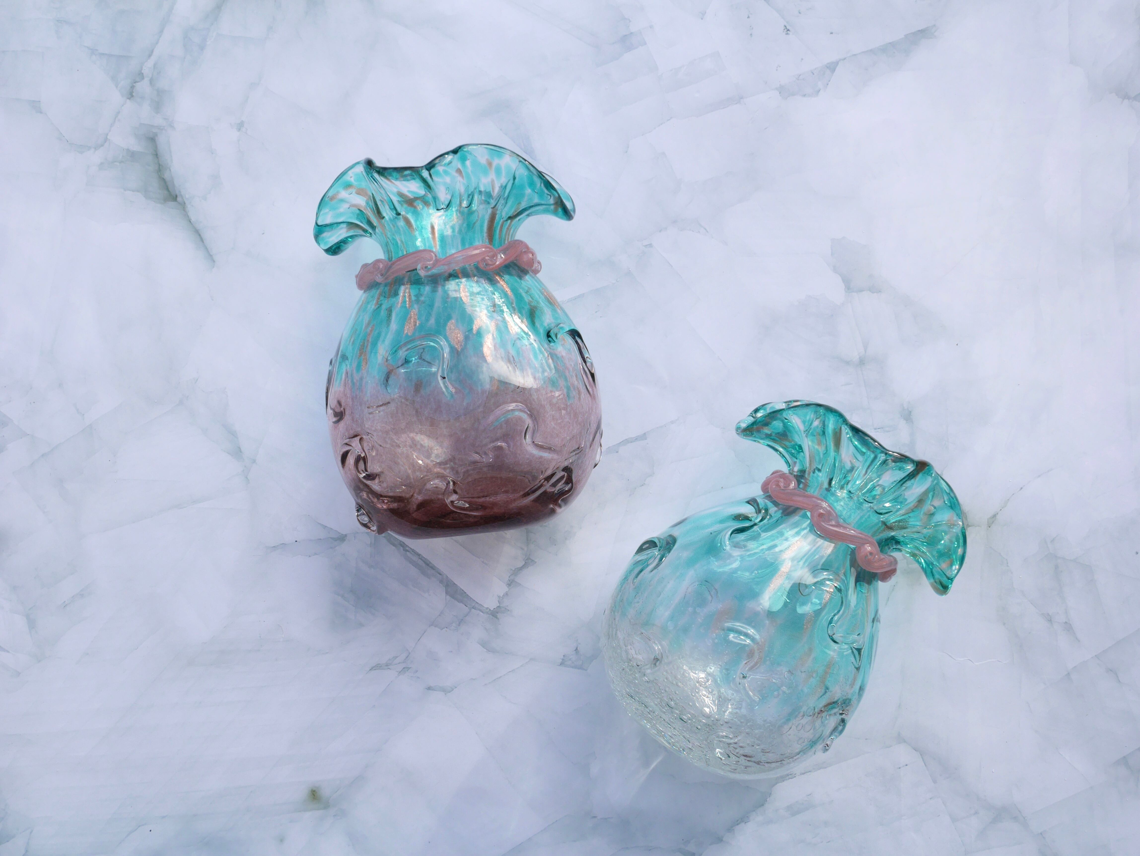クリアガラスとパープル、ブルーのグラデーション、バブルのような気泡が装飾されたなニュアンスカラー花瓶。